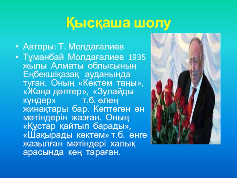 Тұманбай Молдағалиев 1935 жылы Алматы облысының Еңбекшіқазақ