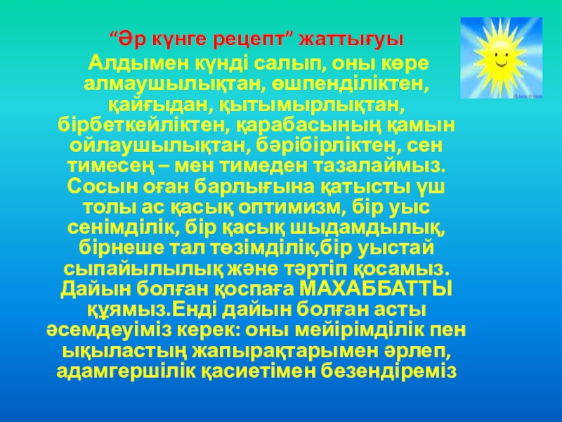 қайғыдан, қытымырлықтан, бірбеткейліктен, қарабасының қамын ойлаушылықтан, бәрібірліктен, сен тимесең – мен тимеден тазалаймыз.Сосын оған барлығына қатысты үш толы ас қасық оптимизм, бір уыс сенімділік, бір қасық шыдамдылық, бірнеше тал төзімділік,бір уыстай сыпайылылық және тәртіп қосамыз.Дайын болған қоспаға МАХАББАТТЫ құямыз.Енді дайын болған асты әсемдеуіміз керек: оны мейірімділік пен ықыластың жапырақтарымен әрлеп, адамгершілік қасиетімен безендіреміз