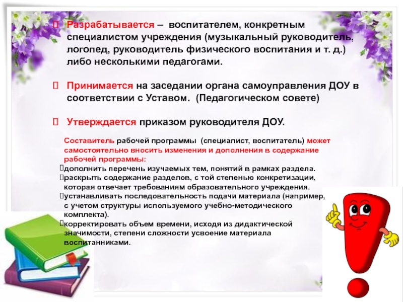 Составитель рабочей программы (специалист, воспитатель) может самостоятельно вносить изменения и дополнения в содержание рабочей программы: