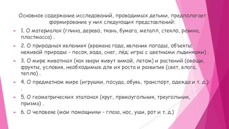Слайд 10Основное содержание исследований, проводимых детьми, предполагает формирование у них следующих представлений: