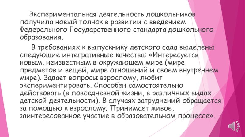 Слайд 3 Экспериментальная деятельность дошкольников получила новый толчок в развитии с введением Федерального