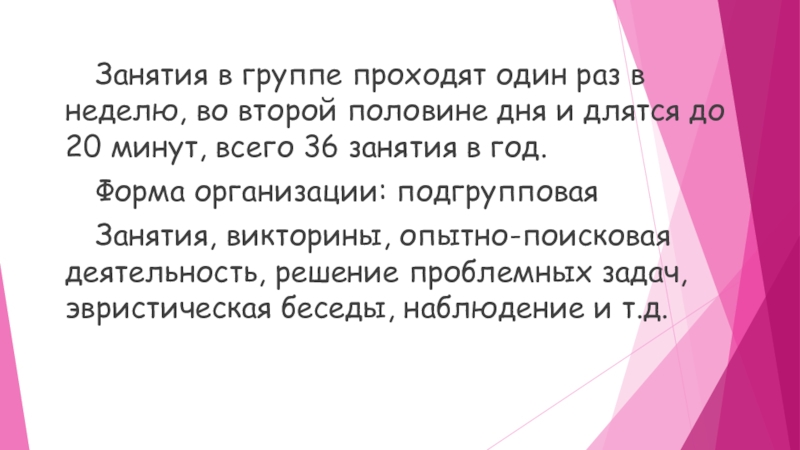 Слайд 8 Занятия в группе проходят один раз в неделю, во второй половине