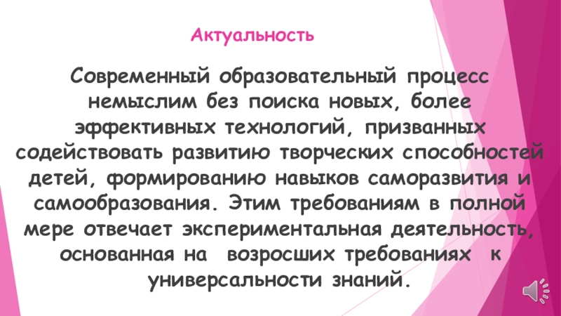 содействовать развитию творческих способностей детей, формированию навыков саморазвития и самообразования. Этим требованиям в полной мере отвечает экспериментальная деятельность, основанная на возросших требованиях к универсальности знаний.