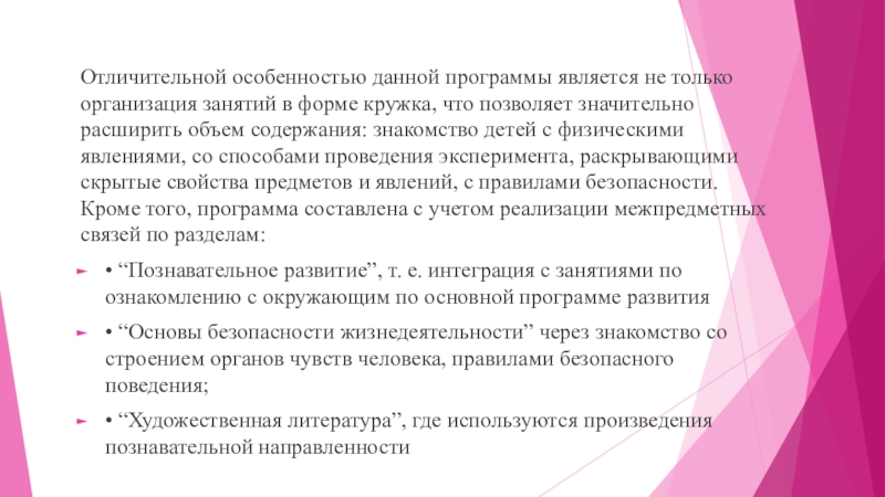 кружка, что позволяет значительно расширить объем содержания: знакомство детей с физическими явлениями, со способами проведения эксперимента, раскрывающими скрытые свойства предметов и явлений, с правилами безопасности. Кроме того, программа составлена с учетом реализации межпредметных связей по разделам: