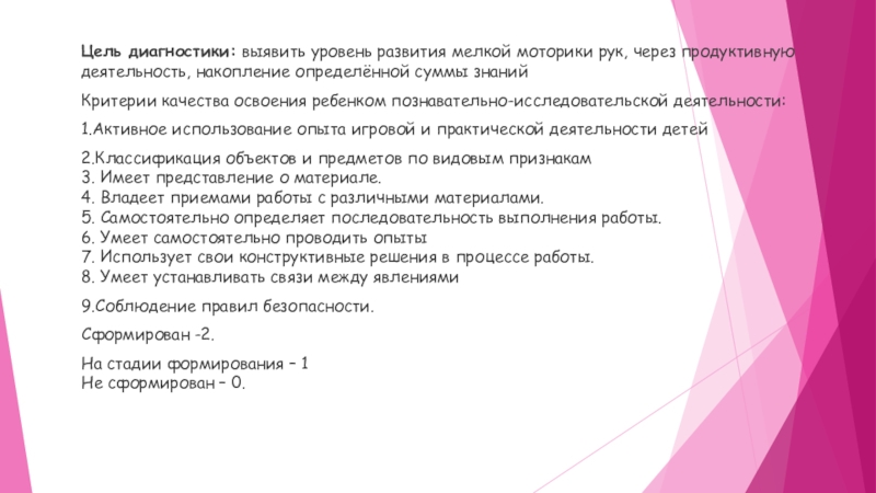 Слайд 12Цель диагностики: выявить уровень развития мелкой моторики рук, через продуктивную деятельность, накопление
