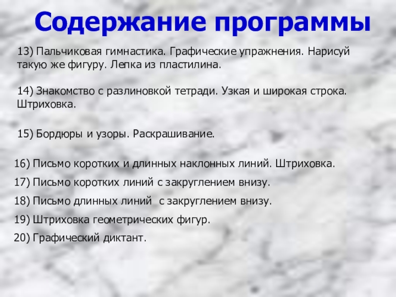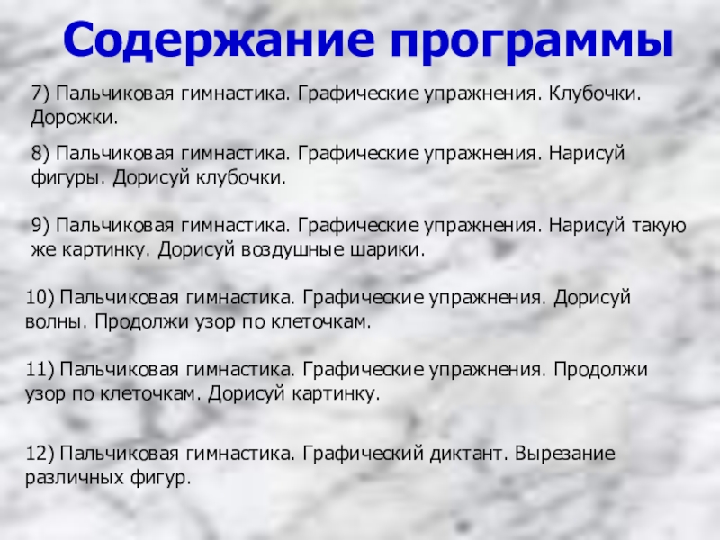 12) Пальчиковая гимнастика. Графический диктант. Вырезание различных фигур.