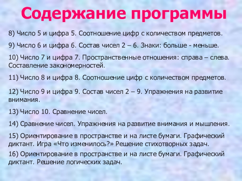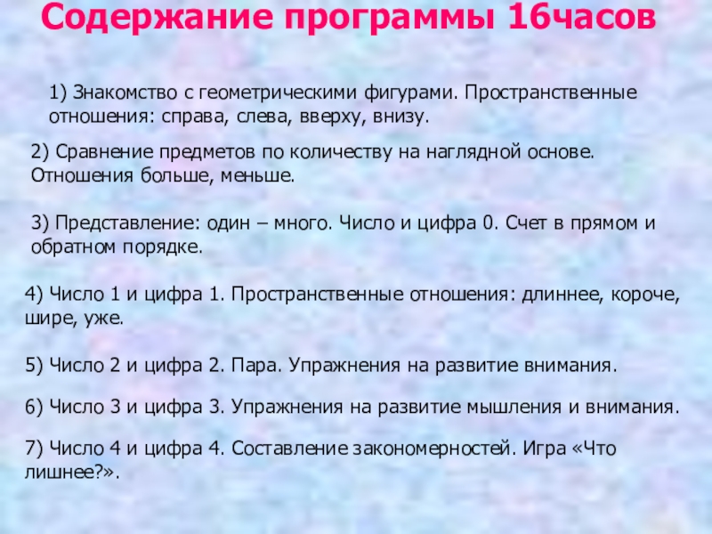 3) Представление: один – много. Число и цифра 0. Счет в прямом и обратном порядке.