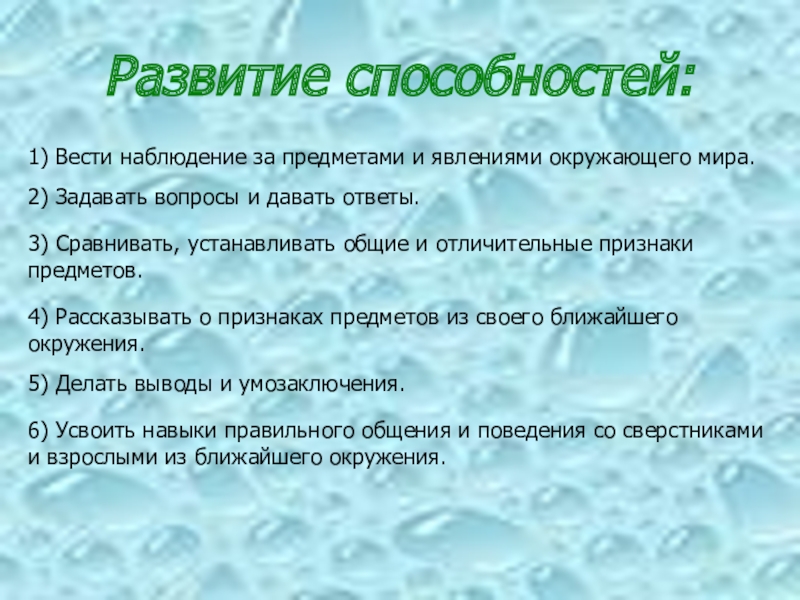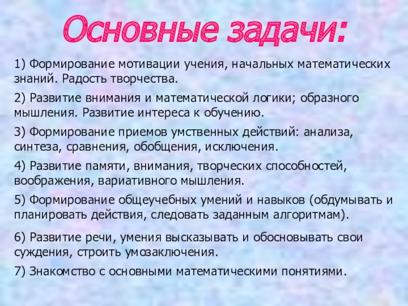 6) Развитие речи, умения высказывать и обосновывать свои суждения, строить умозаключения.
