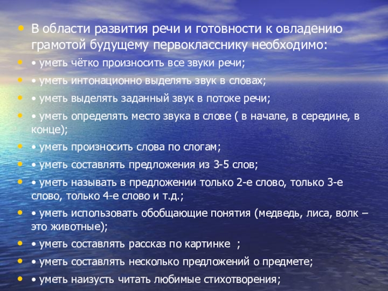8) Умение выражать словами местонахождение предмета, ориентироваться на листе.