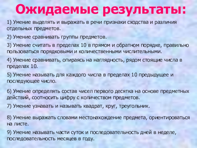 3) Умение считать в пределах 10 в прямом и обратном порядке, правильно пользоваться порядковыми и количественными числительными.