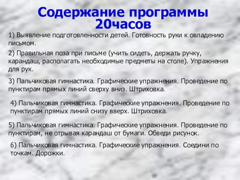 4) Пальчиковая гимнастика. Графические упражнения. Проведение по пунктирам прямых линий снизу вверх. Штриховка.