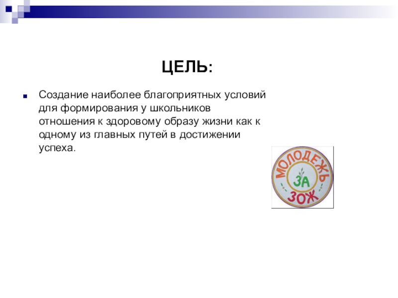 Создание наиболее благоприятных условий для формирования у школьников отношения к здоровому образу жизни как к одному из главных путей в достижении успеха.