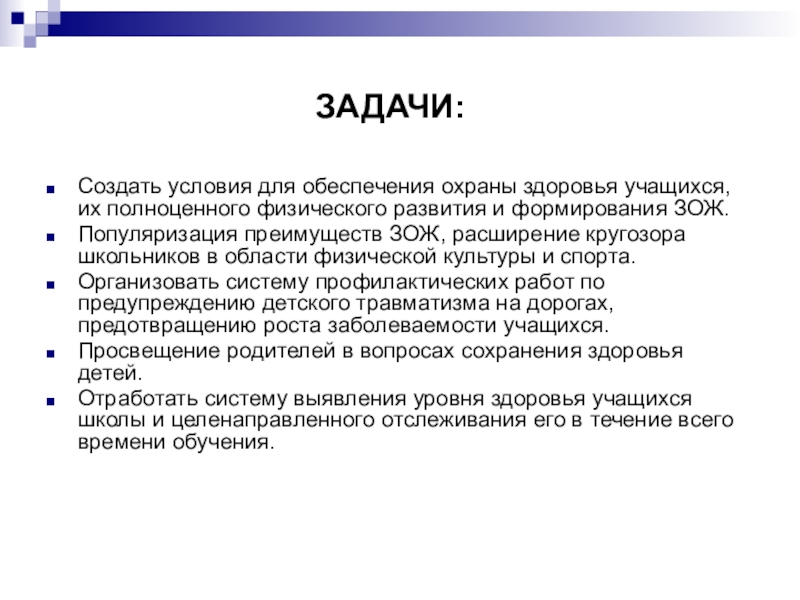 Создать условия для обеспечения охраны здоровья учащихся, их полноценного физического развития и формирования ЗОЖ.