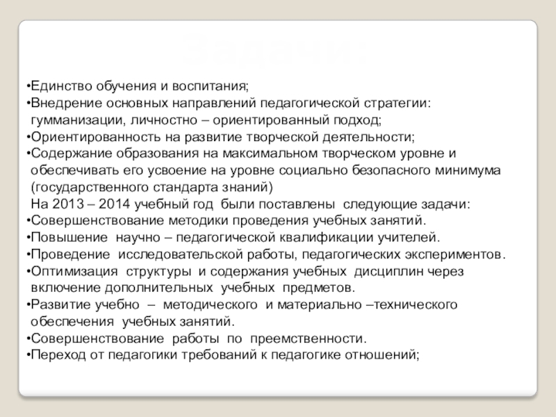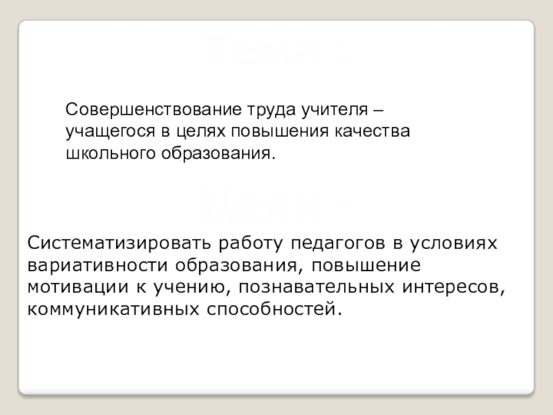 Систематизировать работу педагогов в условиях вариативности образования, повышение мотивации к учению, познавательных интересов, коммуникативных способностей.