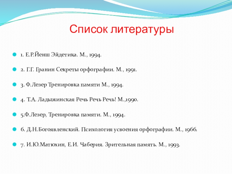 5.Ф.Лезер, Тренировка памяти. М., 1994.