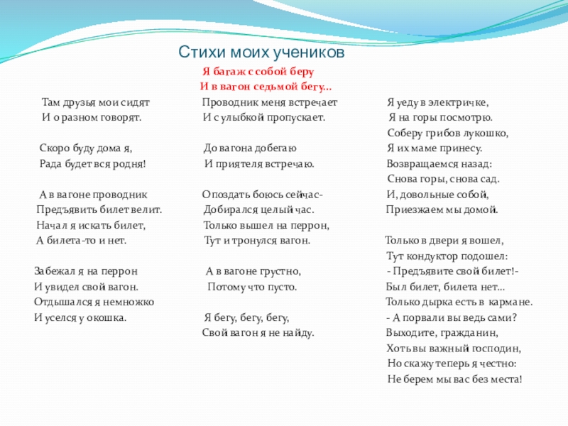 А в вагоне проводник Опоздать боюсь сейчас- И, довольные собой,