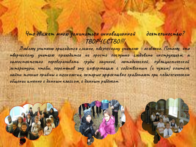приходится сложно, творческому учителю – особенно. Потому, что творческому учителю приходится не просто послушно следовать инструкциям, а самостоятельно переворачивать груды научной, методической, публицистической литературы, чтобы, перемешав эту информацию с собственным (и чужим) опытом, найти точные приёмы и технологии, которые эффективно сработают при педагогическом общении именно с данным классом, с данным ребёнком.
