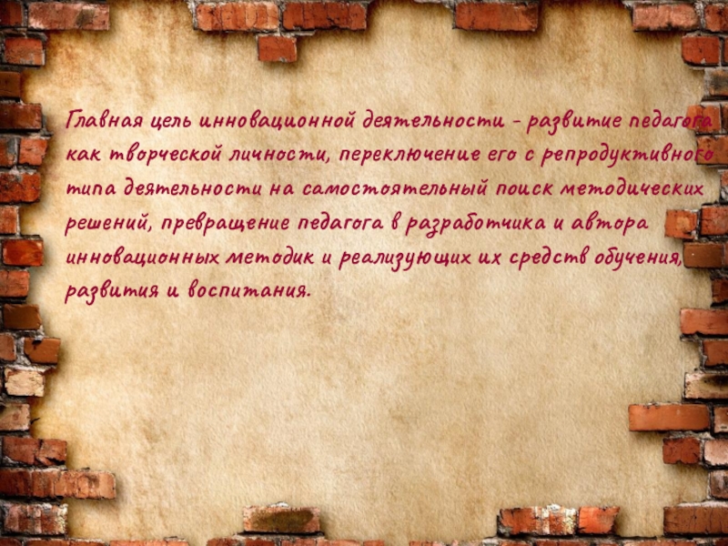 Слайд 8Главная цель инновационной деятельности - развитие педагога как творческой личности, переключение