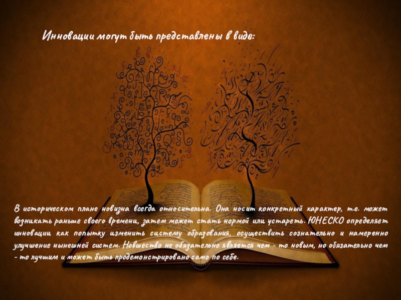 может возникать раньше своего времени, затем может стать нормой или устареть. ЮНЕСКО определяет инновации как попытку изменить систему образования, осуществить сознательно и намеренно улучшение нынешней систем. Новшество не обязательно является чем - то новым, но обязательно чем - то лучшим и может быть продемонстрировано само по себе.