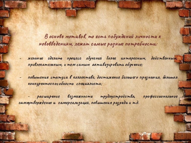 Слайд 11В основе мотивов, то есть побуждений личности к нововведениям, лежат самые