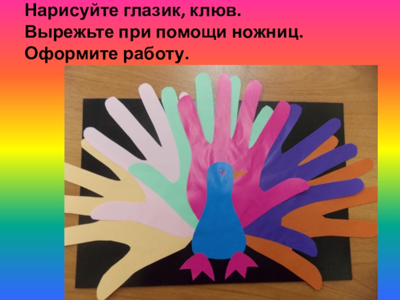 Слайд 17Нарисуйте глазик, клюв. Вырежьте при помощи ножниц. Оформите работу.