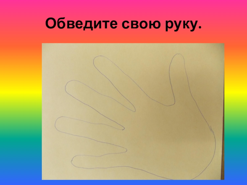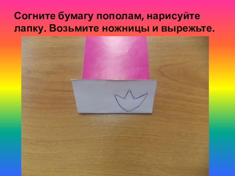 Слайд 15Согните бумагу пополам, нарисуйте лапку. Возьмите ножницы и вырежьте.