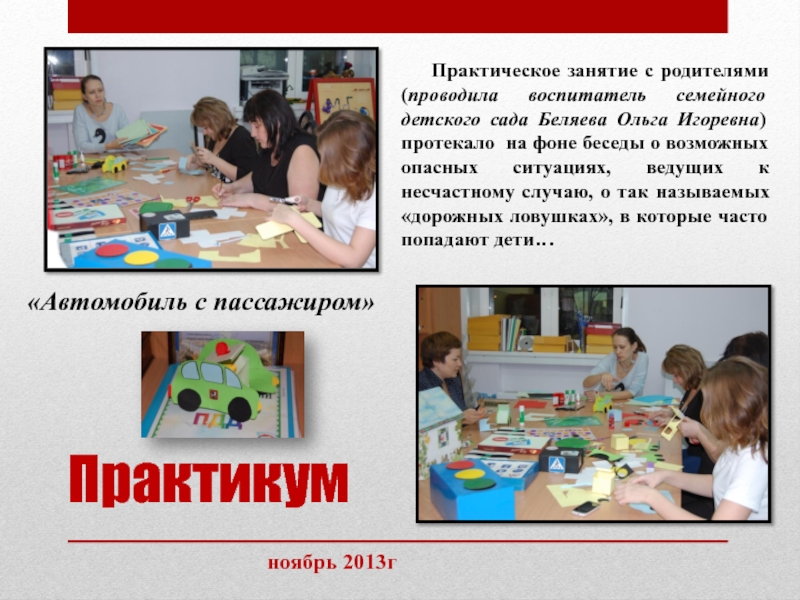 Практическое занятие с родителями (проводила воспитатель семейного детского сада Беляева Ольга Игоревна) протекало на фоне беседы о возможных опасных ситуациях, ведущих к несчастному случаю, о так называемых «дорожных ловушках», в которые часто попадают дети…