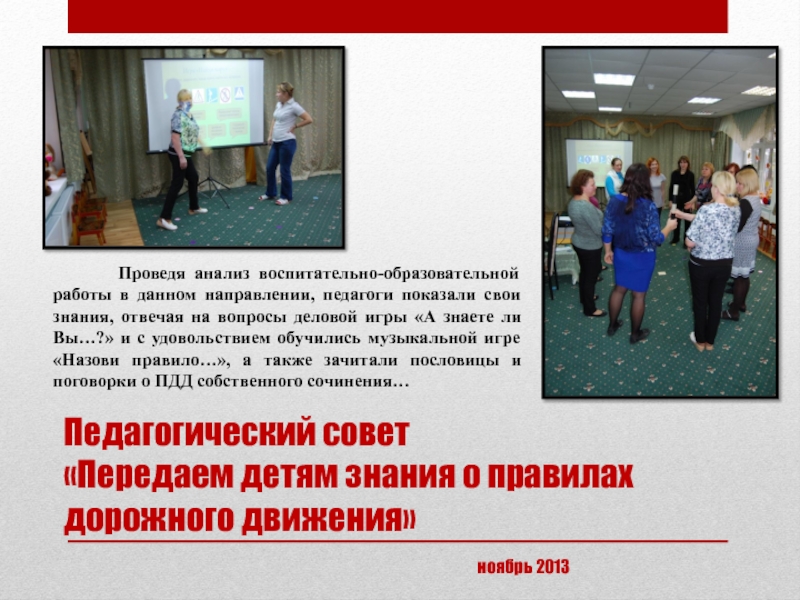 Проведя анализ воспитательно-образовательной работы в данном направлении, педагоги показали свои знания, отвечая на вопросы деловой игры «А знаете ли Вы…?» и с удовольствием обучились музыкальной игре «Назови правило…», а также зачитали пословицы и поговорки о ПДД собственного сочинения…