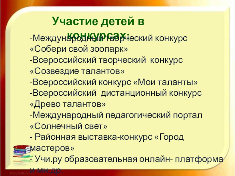 Это сайт презентаций, где можно хранить и обмениваться своими презентациями, докладами, проектами, шаблонами в формате PowerPoint с другими пользователями. Мы помогаем школьникам, студентам, учителям, преподавателям хранить и обмениваться учебными материалами.