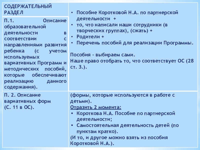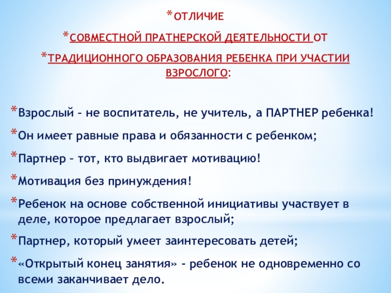 предлагается особая форма проведения занятий (в противовес школьно-урочной) – совместная партнерская деятельность взрослого с детьми.