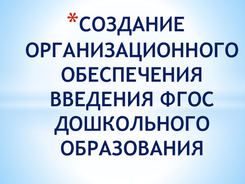 Слайд 1СОЗДАНИЕ ОРГАНИЗАЦИОННОГО ОБЕСПЕЧЕНИЯ ВВЕДЕНИЯ ФГОС ДОШКОЛЬНОГО ОБРАЗОВАНИЯ