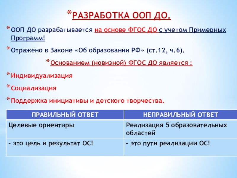 ООП ДО разрабатывается на основе ФГОС ДО с учетом
