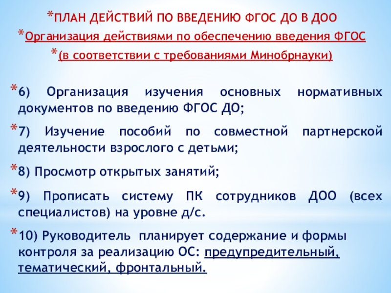 Слайд 6ПЛАН ДЕЙСТВИЙ ПО ВВЕДЕНИЮ ФГОС ДО В ДОО