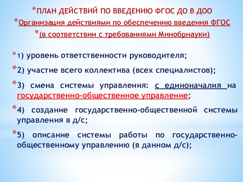 Слайд 5ПЛАН ДЕЙСТВИЙ ПО ВВЕДЕНИЮ ФГОС ДО В ДОО