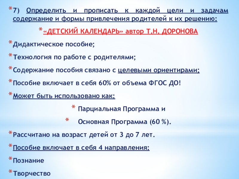 7) Определить и прописать к каждой цели и задачам содержание и формы привлечения родителей к их решению: