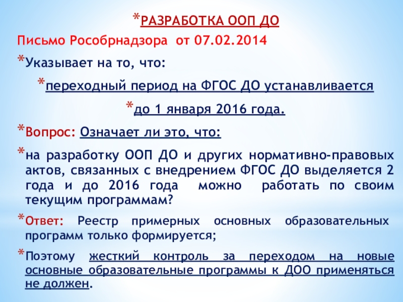 Поэтому жесткий контроль за переходом на новые основные образовательные программы к ДОО применяться не должен.