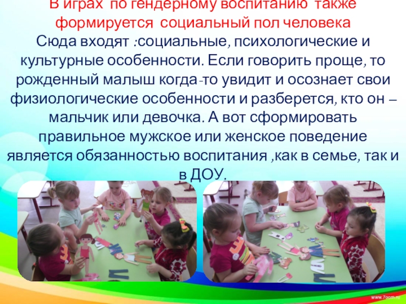 Слайд 14В играх по гендерному воспитанию также формируется социальный пол человека