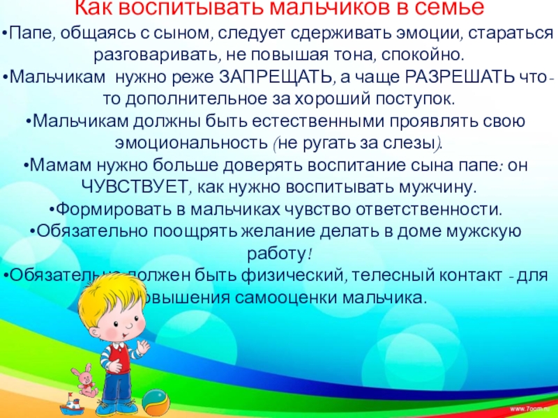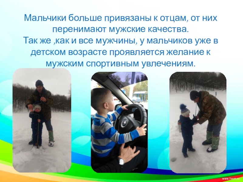 Слайд 9Мальчики больше привязаны к отцам, от них перенимают мужские качества.
