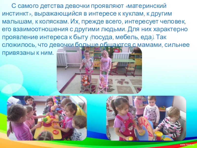проявляют «материнский инстинкт», выражающийся в интересе к куклам, к другим малышам, к коляскам. Их, прежде всего, интересует человек, его взаимоотношения с другими людьми. Для них характерно проявление интереса к быту (посуда, мебель, еда). Так сложилось, что девочки больше общаются с мамами, сильнее привязаны к ним.