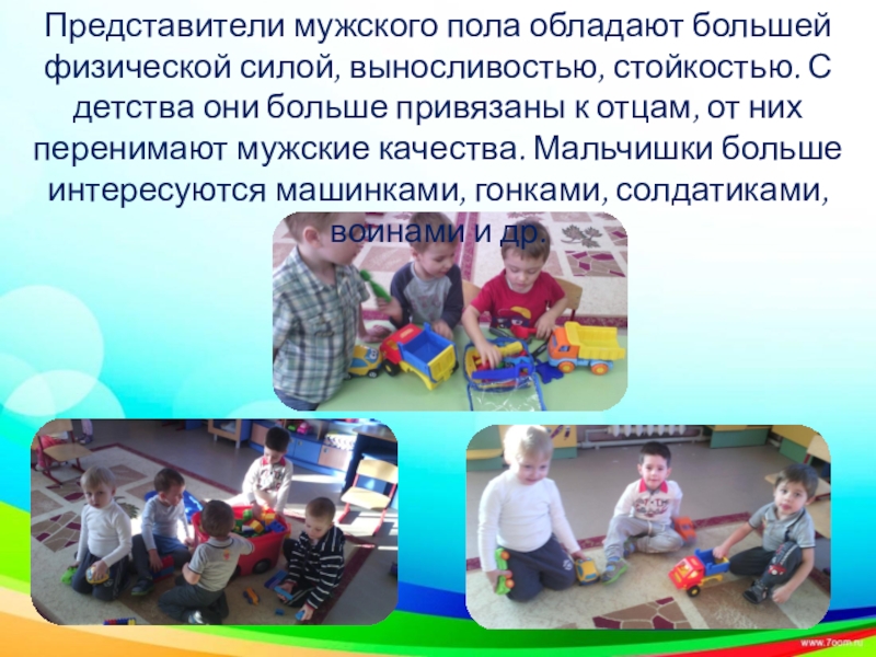 Слайд 7Представители мужского пола обладают большей физической силой, выносливостью, стойкостью. С детства