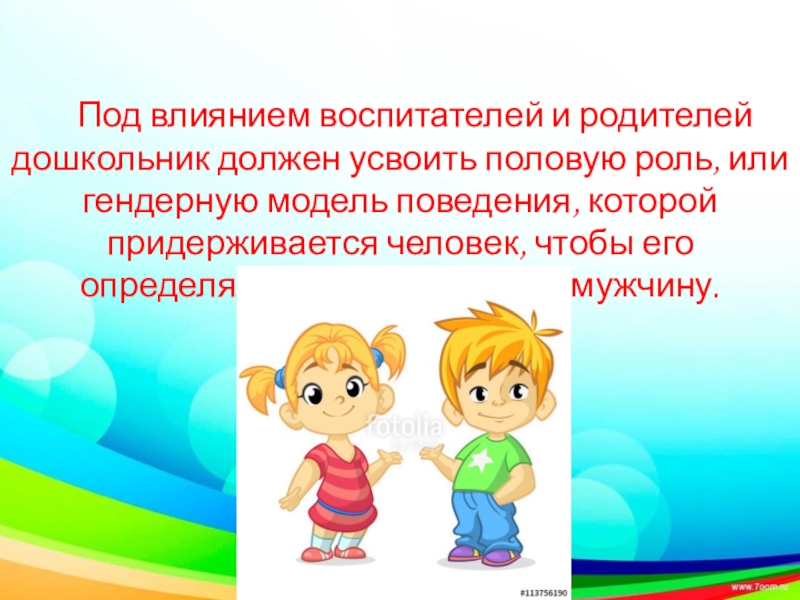 Слайд 4Под влиянием воспитателей и родителей дошкольник должен усвоить половую роль, или