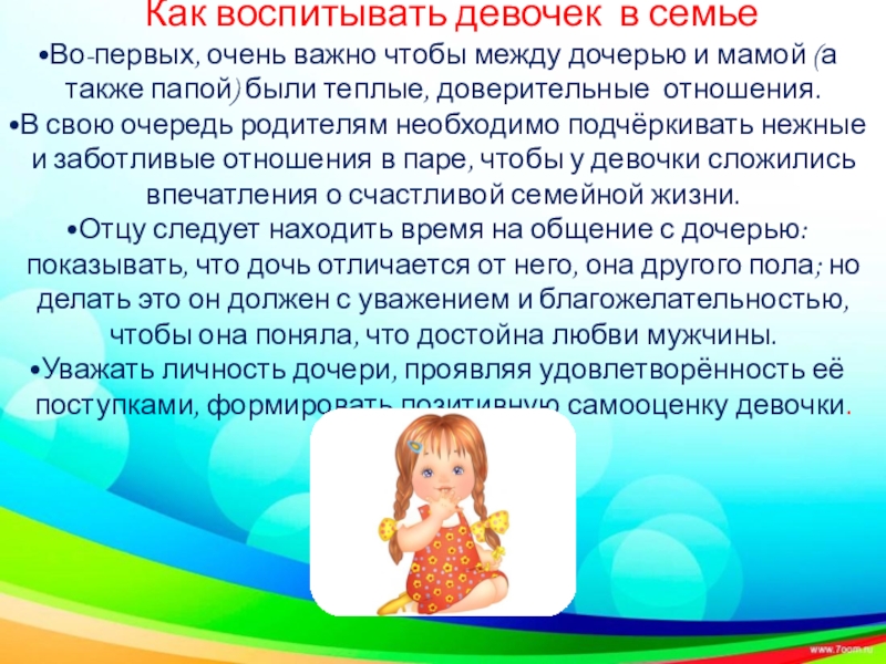 Уважать личность дочери, проявляя удовлетворённость её поступками, формировать позитивную самооценку девочки.