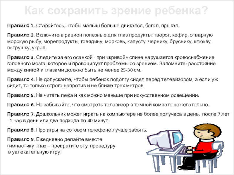 1. Жмурки. Закрыть глаза, сильно напрягая глазные мышцы, на счет 1 - 4, затем раскрыть глаза, расслабив мышцы глаз, посмотрев вдаль, на счет 1 - 6. Повторить 4 - 5 раз.