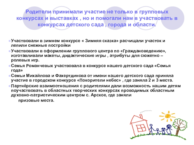 Партнёрские взаимоотношения с родителями дали возможность нашим детям поучаствовать в областных творческих конкурсах проводимых областным духовно-патриотическим центром с. Арское, где заняли