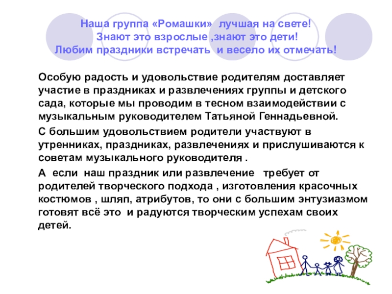 Особую радость и удовольствие родителям доставляет участие в праздниках и развлечениях группы и детского сада, которые мы проводим в тесном взаимодействии с музыкальным руководителем Татьяной Геннадьевной.