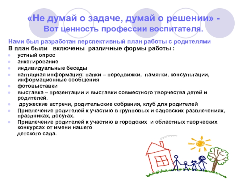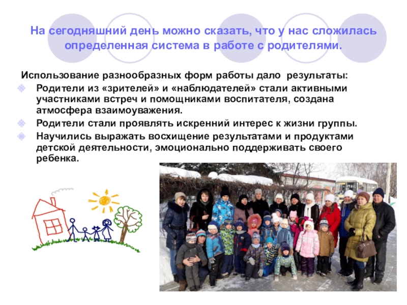 Родители из «зрителей» и «наблюдателей» стали активными участниками встреч и помощниками воспитателя, создана атмосфера взаимоуважения.