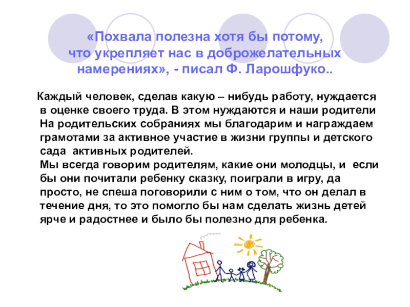 Каждый человек, сделав какую – нибудь работу, нуждается в оценке своего труда. В этом нуждаются и наши родители На родительских собраниях мы благодарим и награждаем грамотами за активное участие в жизни группы и детского сада активных родителей.