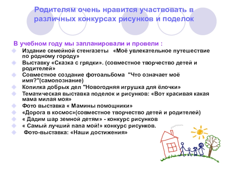выставка – презентации и выставки совместного творчества детей и родителей.