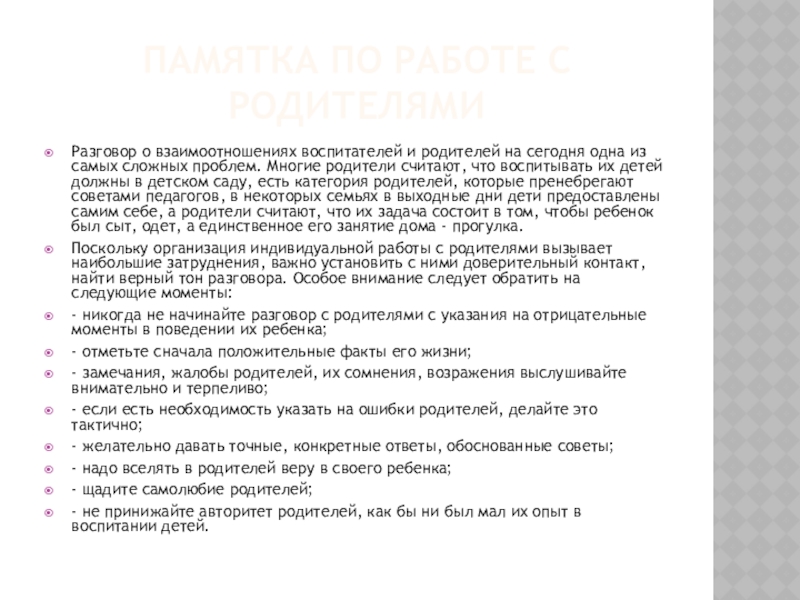 Памятка по работе с родителямиРазговор о взаимоотношениях воспитателей и родителей на сегодня одна из самых сложных проблем.