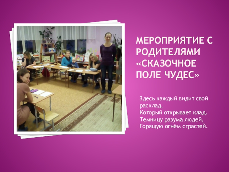 Мероприятие с родителями «Сказочное поле чудес» Здесь каждый видит свой расклад,Который открывает клад.Темницу разума людей,Горящую огнём страстей.